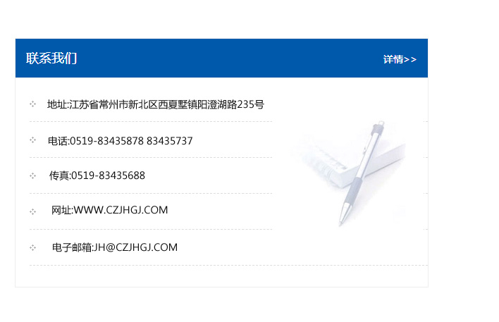 地址:常州市新北區友邦商務大廈1幢16、17層  電話:0519-85101652  傳真:0519-85112595  郵編:213022  網址:www_cz-jiayue_cn.xaqssw.com  郵箱:xiajifengaa@163.com